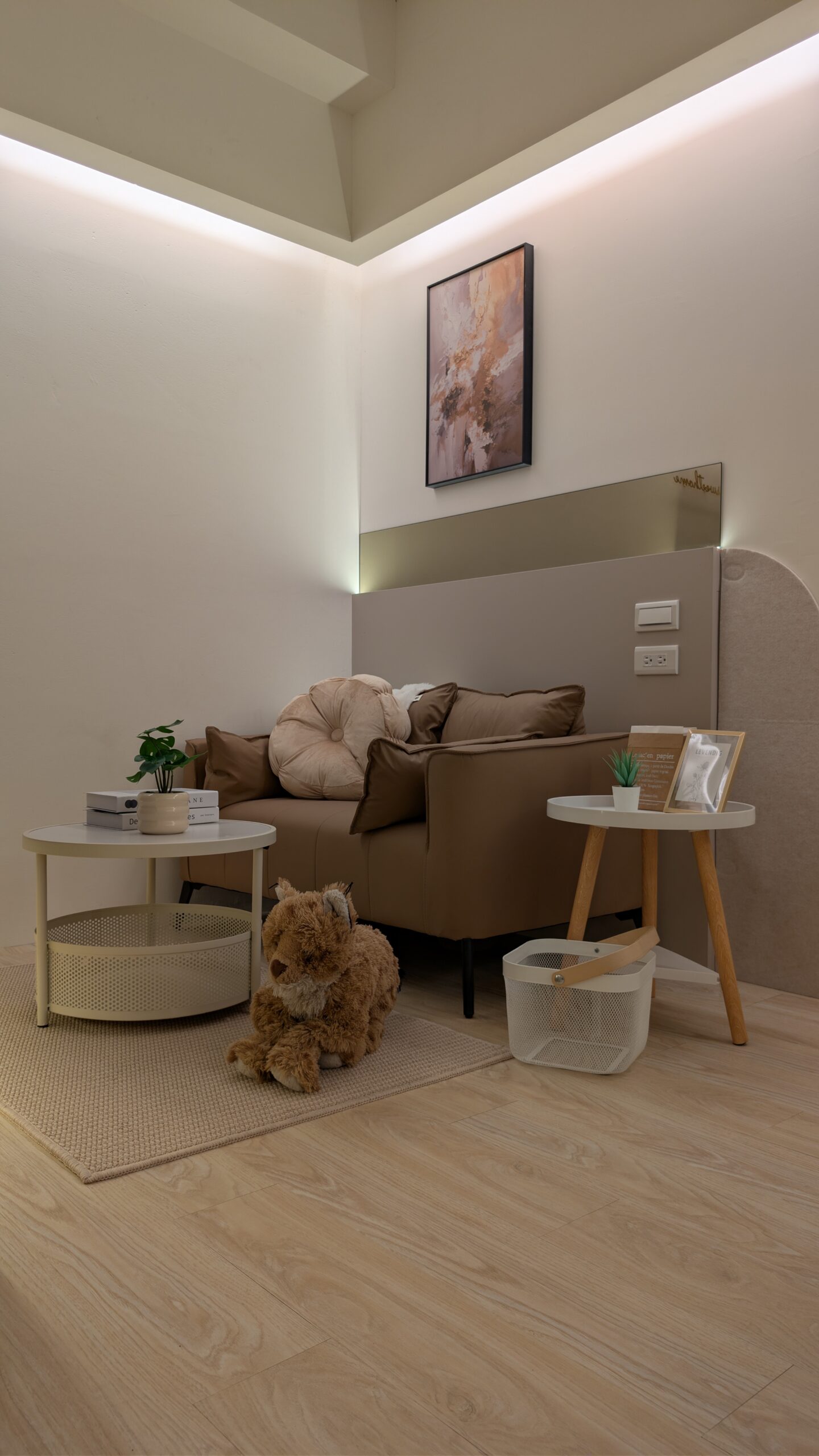 預約諮詢空間以溫潤的奶油色系為視覺基底,搭配細緻木質紋理鋪陳空間層次,營造柔和而無壓的視覺感受。捨棄高飽和色彩,透過大面積淺色調與溫潤材質,讓空間呈現寧靜、放鬆的居住氛圍,讓居住者踏入室內的一刻,便能卸下外界喧囂,為居住者帶來安定且舒心的生活體驗。