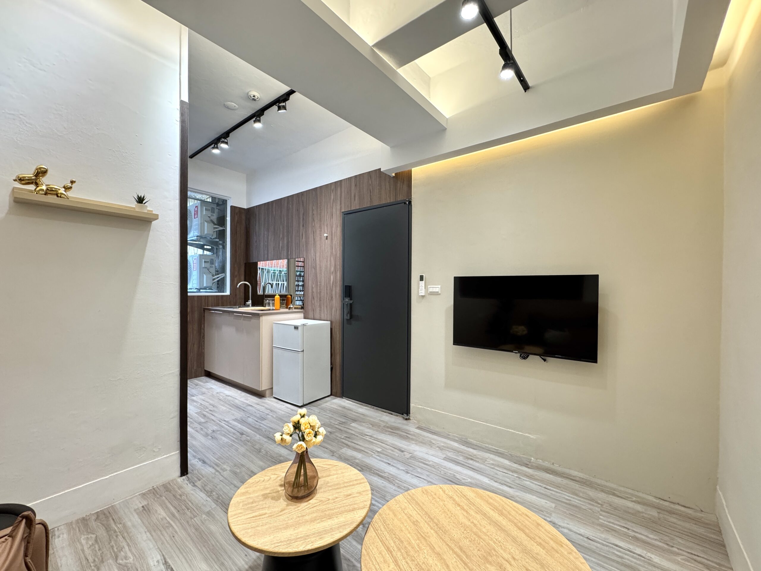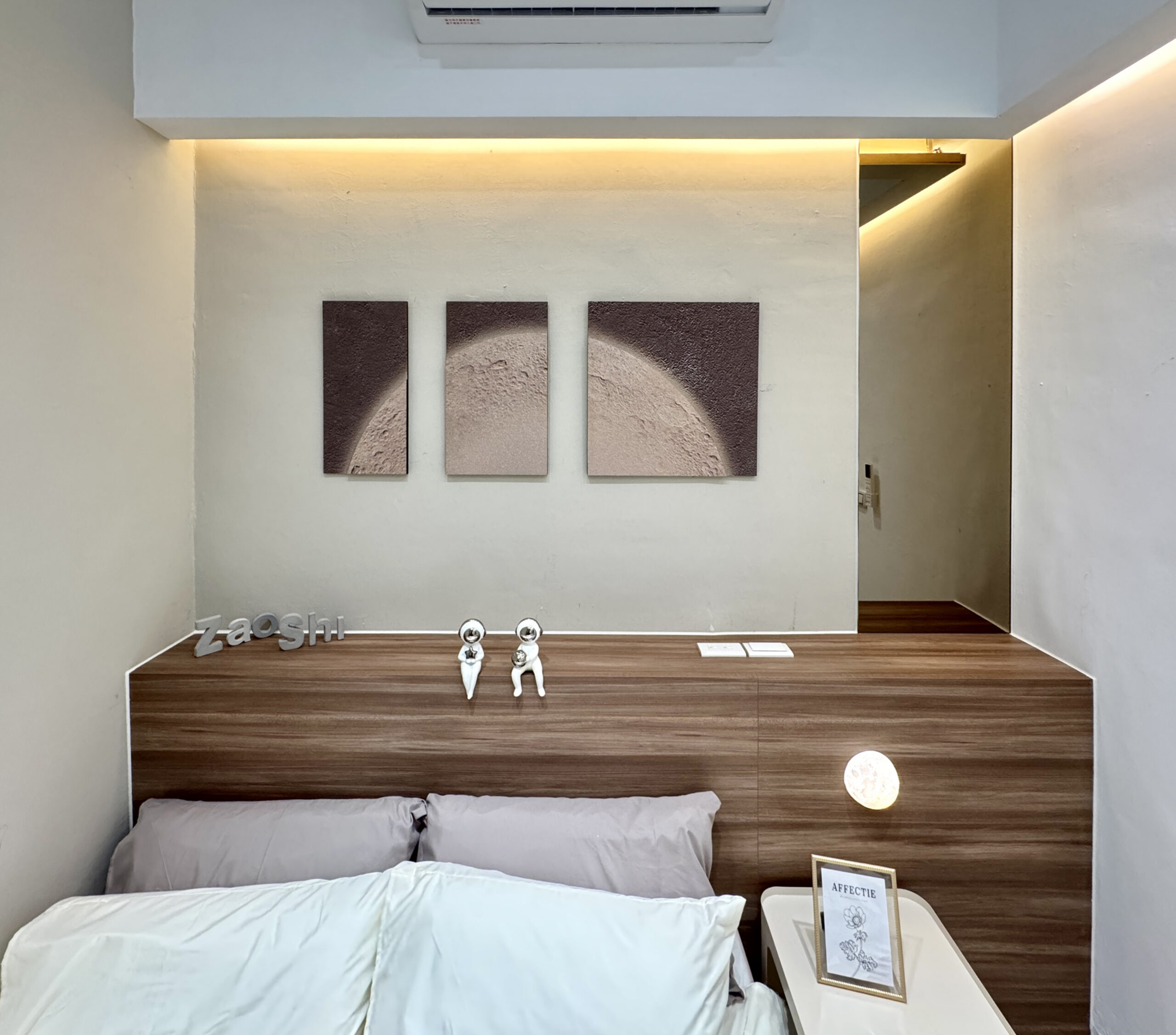 搭配柔和間接照明,營造溫暖舒適氛圍。家具線條簡潔、比例精緻,透過一致的色系與材質連貫性,使空間雖小卻不顯侷促,展現現代侘寂風的靜謐美學。