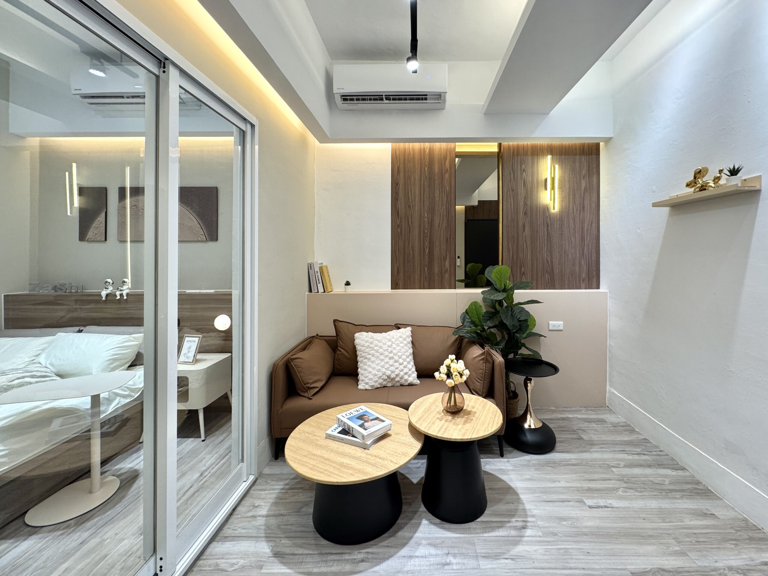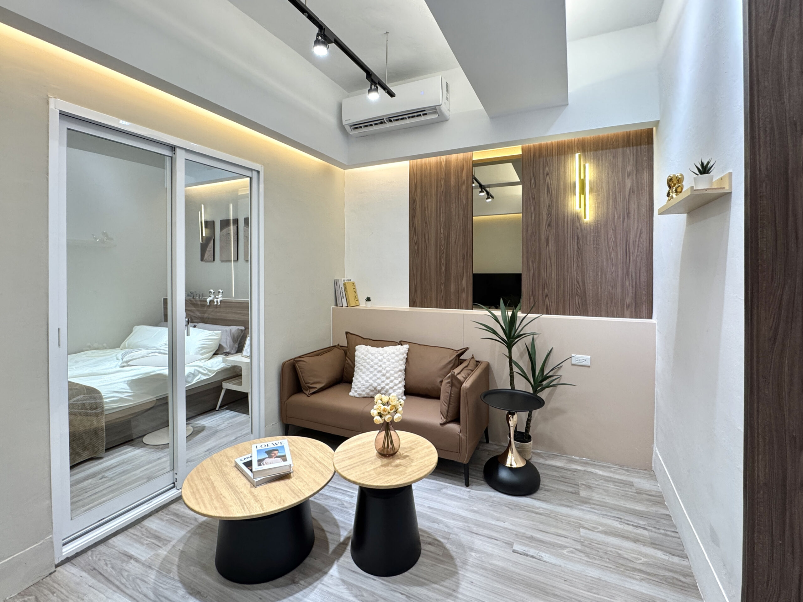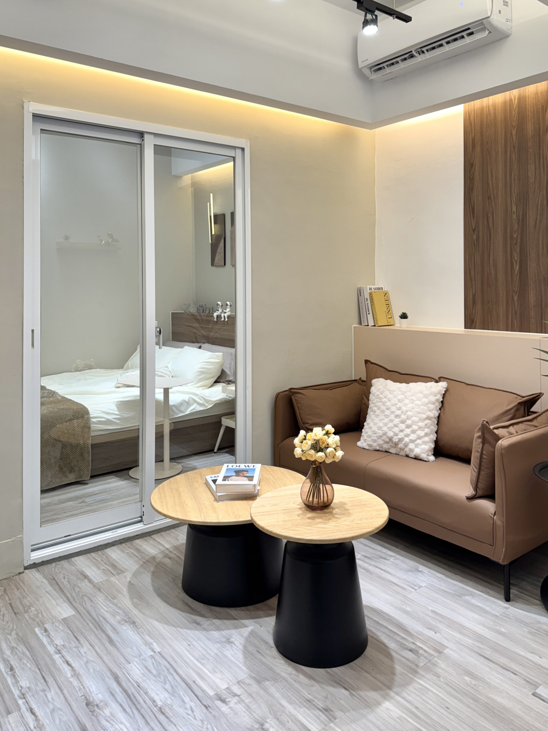 運用玻璃拉門讓臥室與客廳互相延伸,創造開闊感。整體色調以米白與木質棕為主軸,