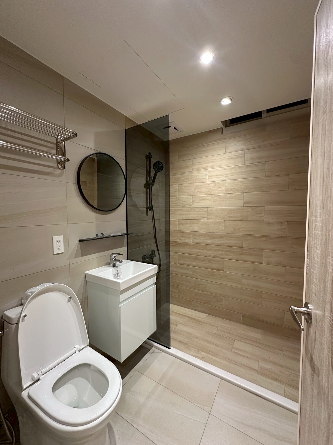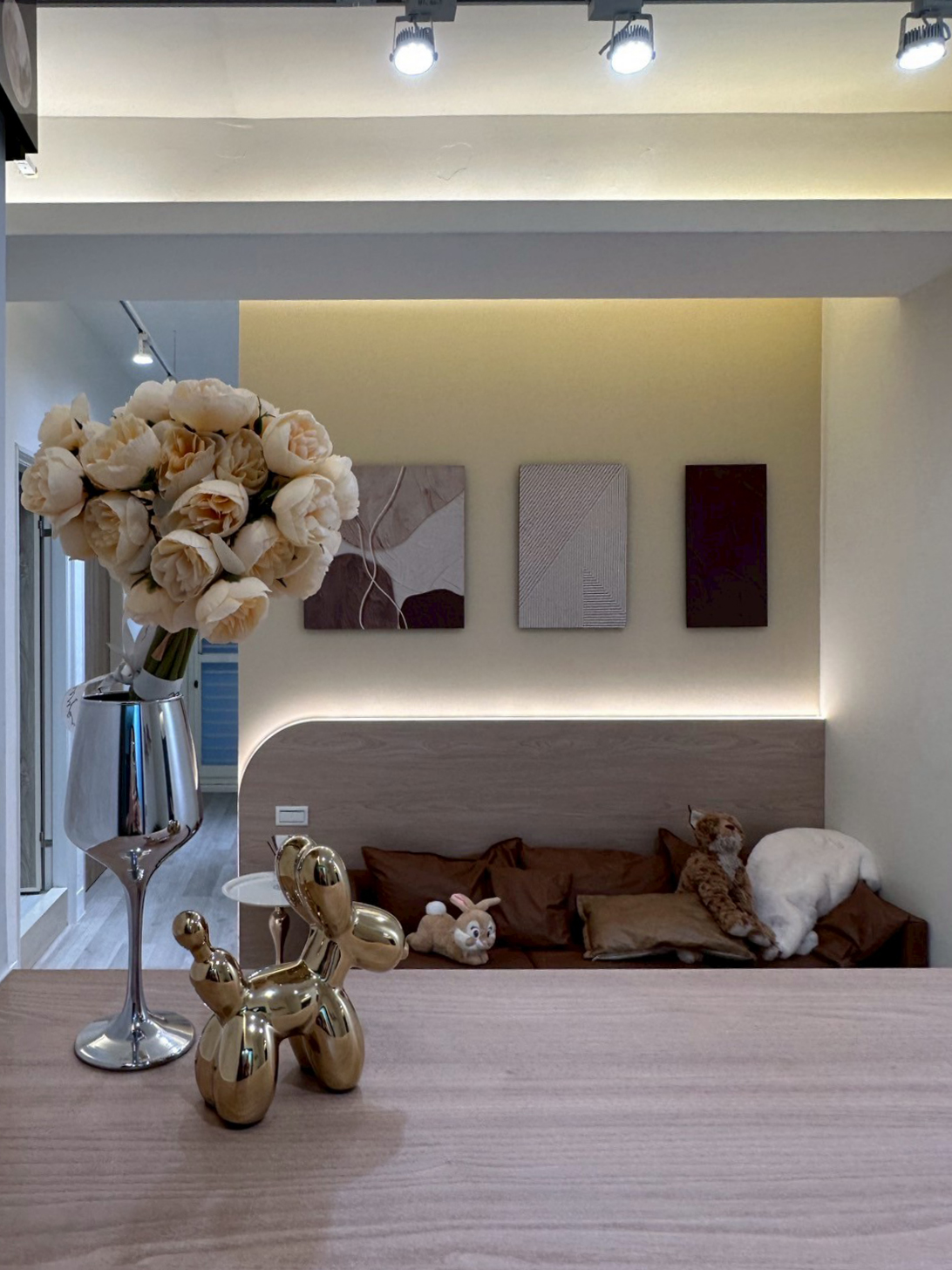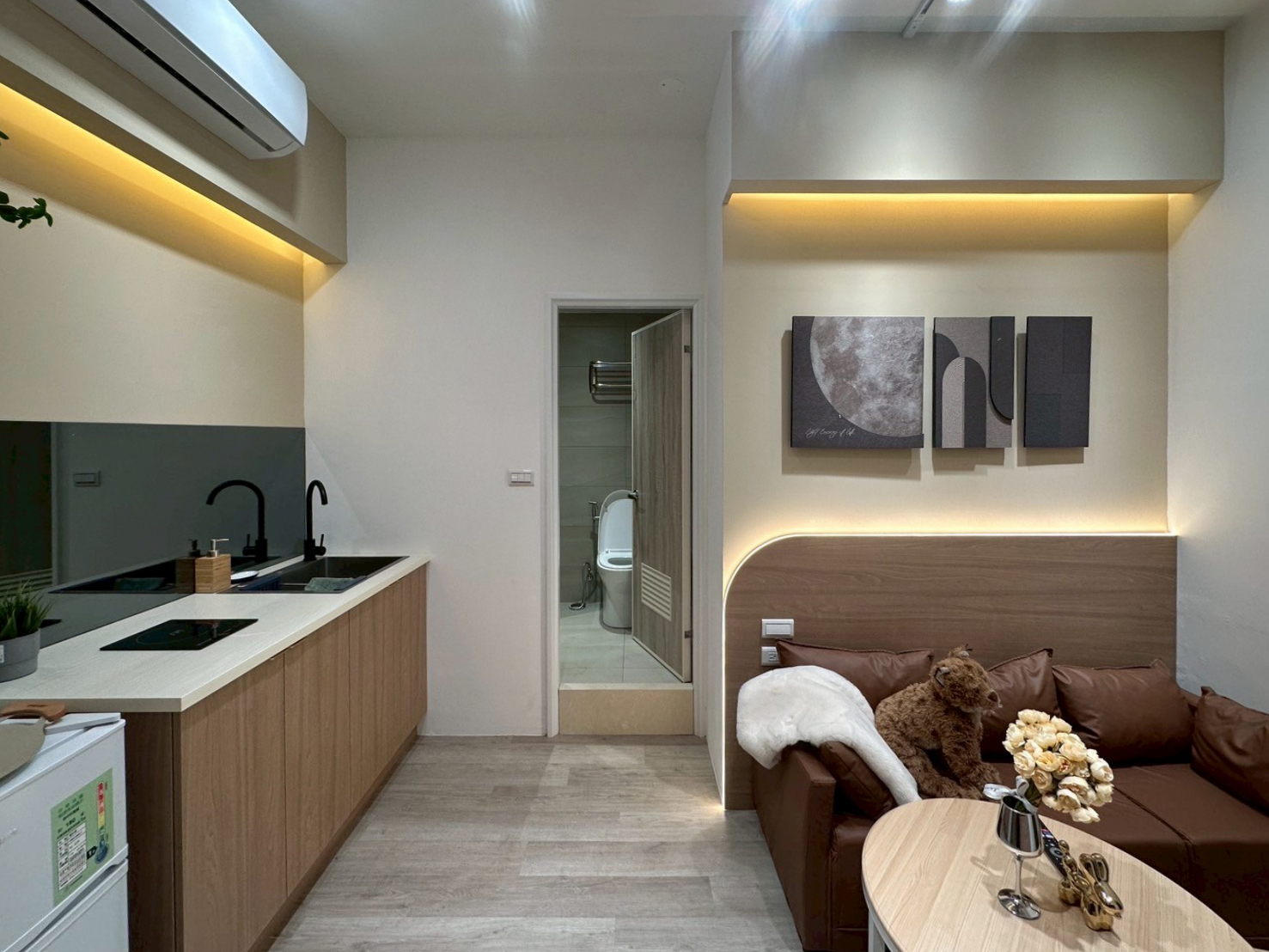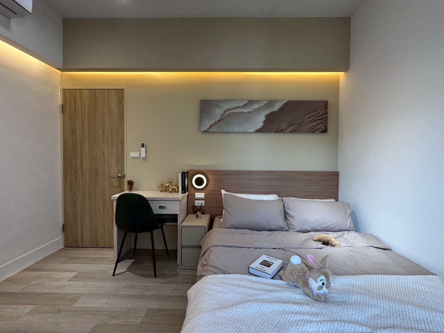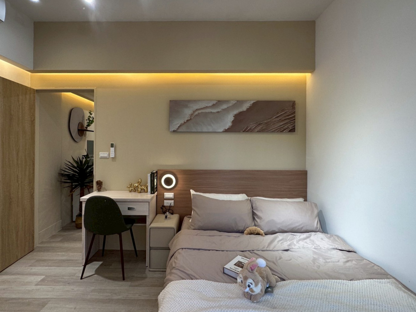 柔和的米白與木質色調交織出自然與簡約的平衡。間接燈光營造層次,讓空間視覺更為延伸。