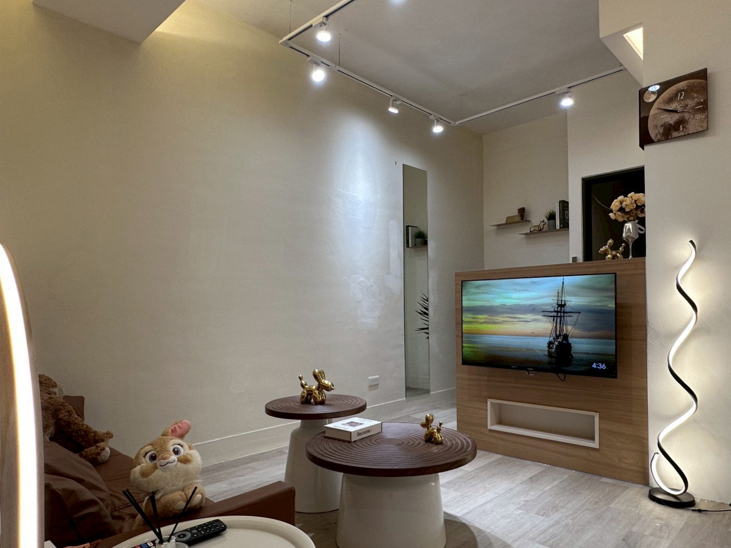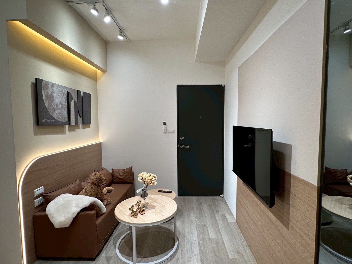 電視牆與廚房巧妙結合,兼具功能與美感;細節如線條燈、金色裝飾與植栽,增添一抹生活質感。整體風格清新俐落,展現都會生活中溫馨且自在的居家節奏。