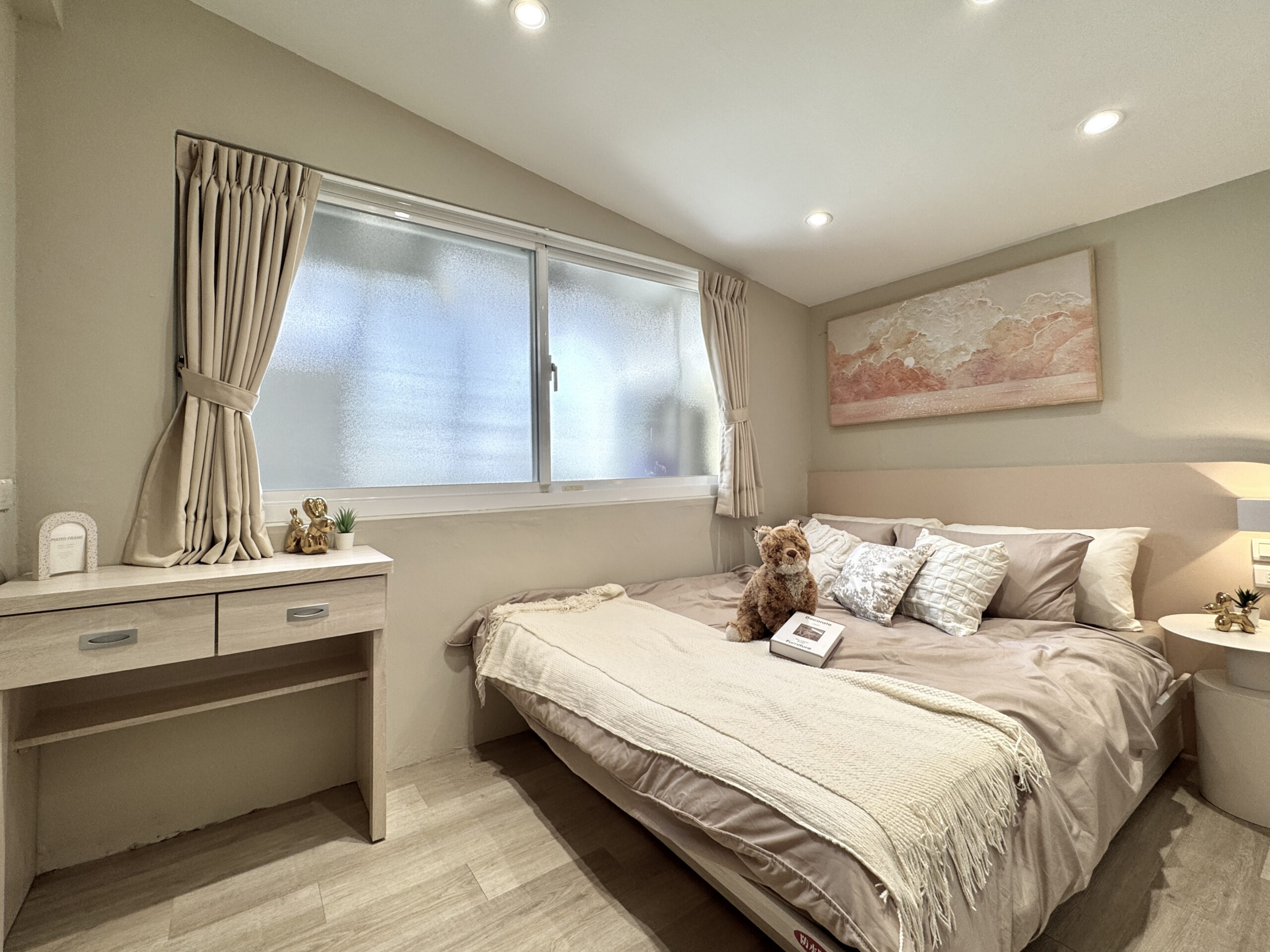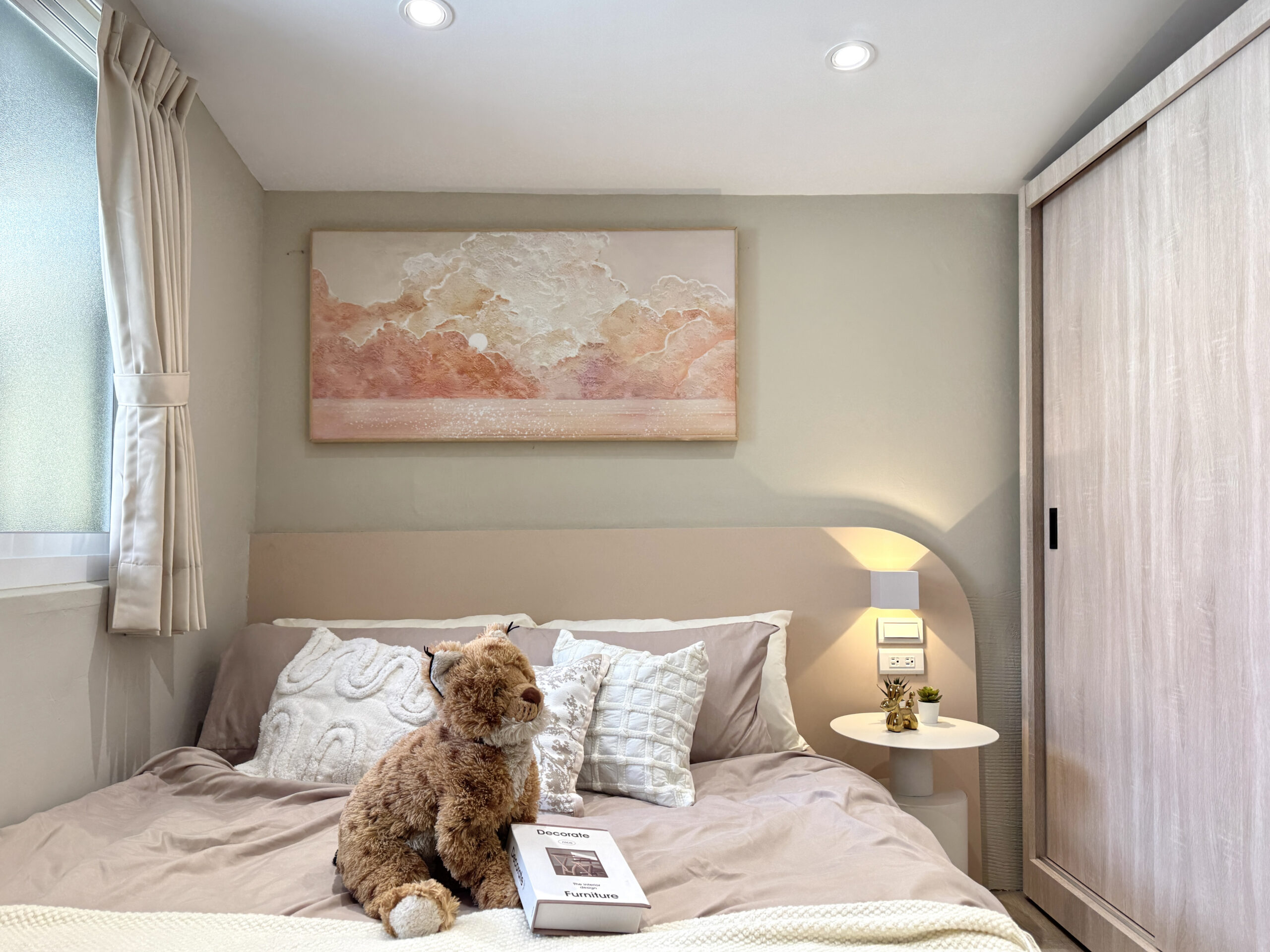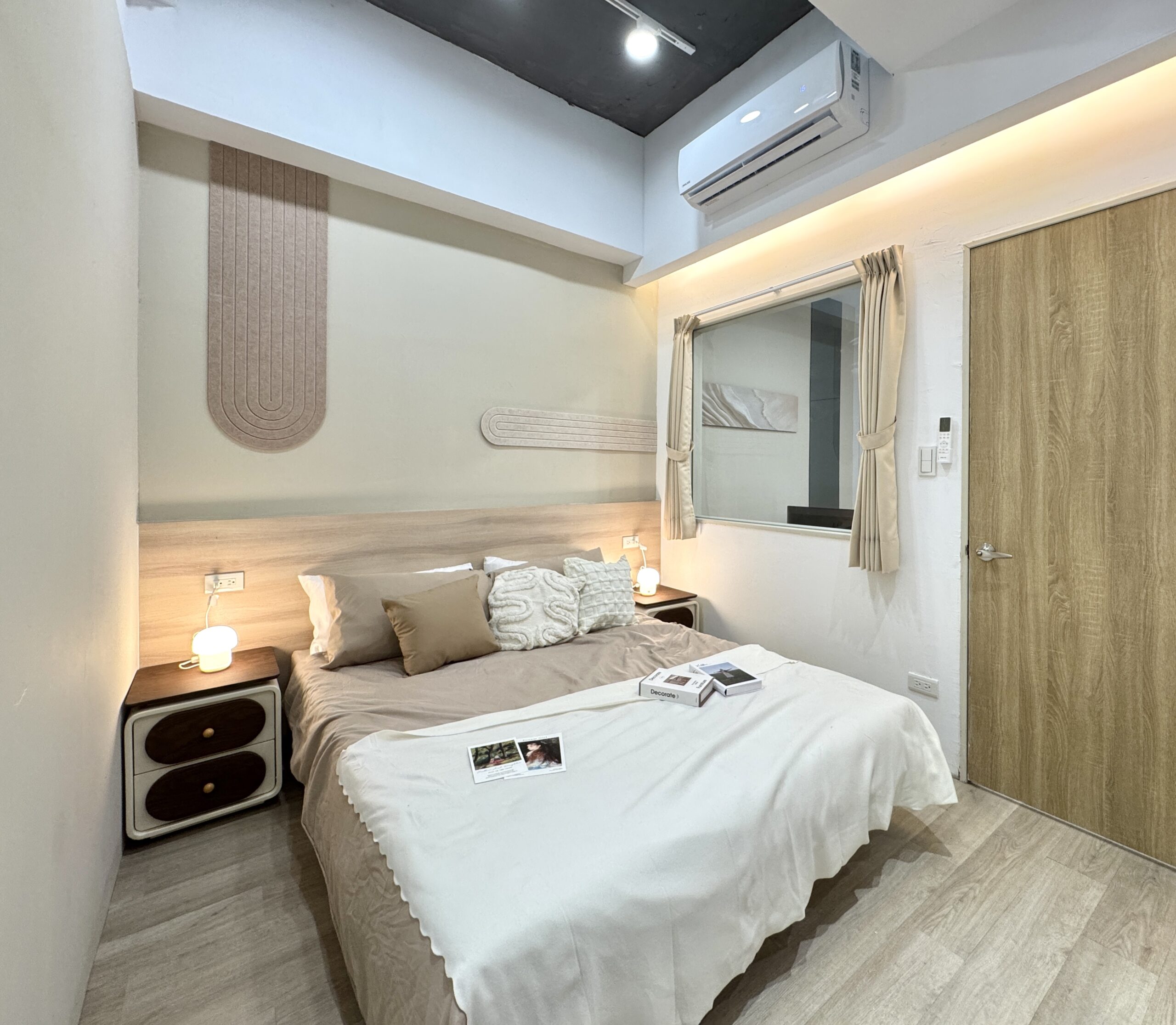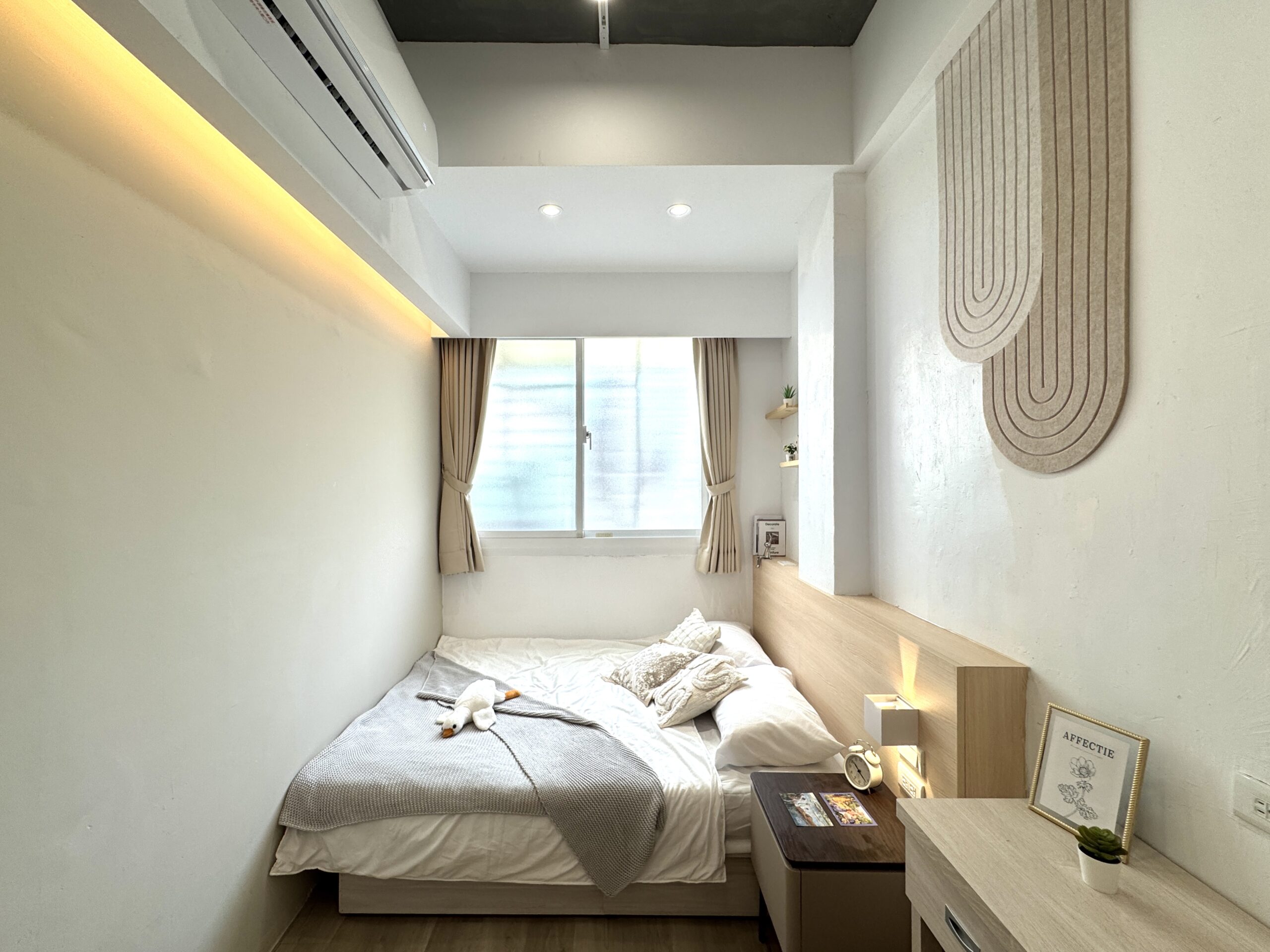 預約諮詢以「現代奶茶」色調為主軸,營造出簡約卻不失溫度的美感。雖位於巷弄間、採光受限,透過巧妙的開窗設計,引入柔和自然光,讓空間展現通透層次。狹長格局經精緻規劃後,動線流暢、視覺延伸,呈現舒適而不壅擠的居家氛圍。