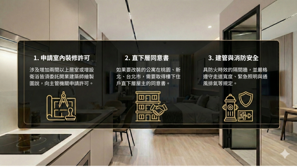 這是目前雙北地區執行最嚴格的條款。為了維護樓下住戶權益,若工程涉及增設衛浴或墊高地板,必須取得「直下層屋主的同意書」。許多自行發包的房東往往因無法克服鄰里溝通問題,導致工程停擺甚至遭檢舉拆除。